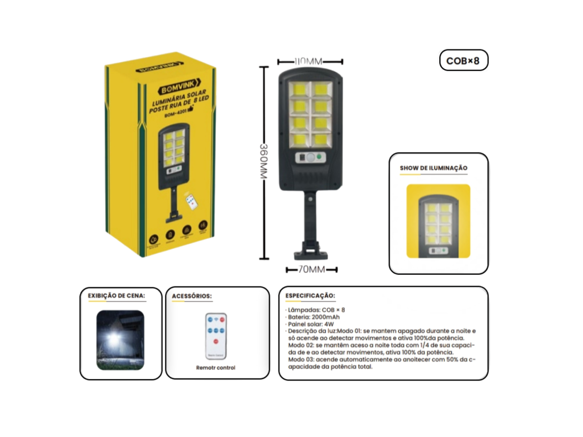 LUMINARIA SOLAR POSTE DE RUA 8 LED BOM-4201