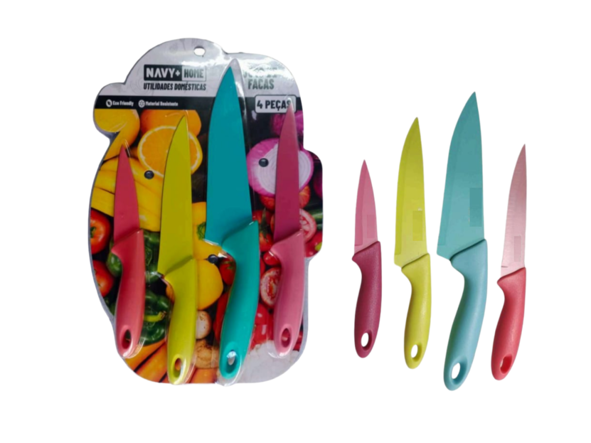 FACA DE COZINHA KIT C/ 4 PCS 3,5" 5" 5,5" 6,5" COLORIDA CABO DE PLASTICO 55016