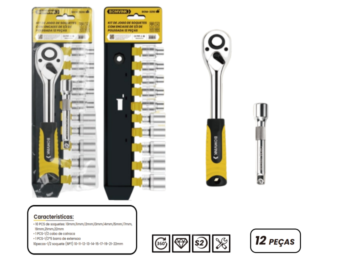 CHAVE CATRACA COM SOQUETES ENCAIXE DE 1/2" COM 12 PÇS BOM-3210