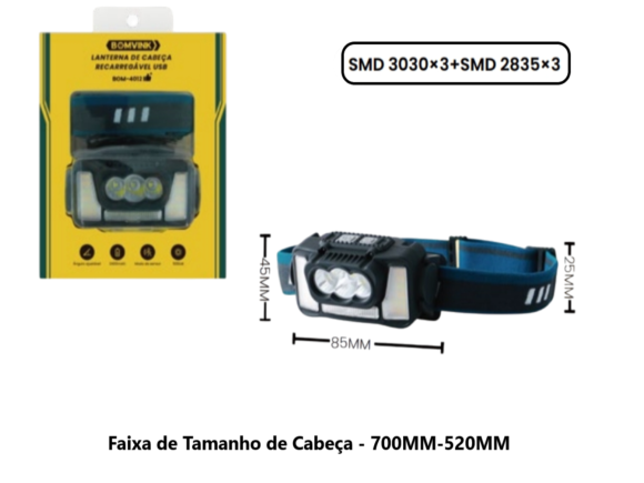 LANTERNA DE CABEÇA LED RECARREGAVEL USB BOM-4011