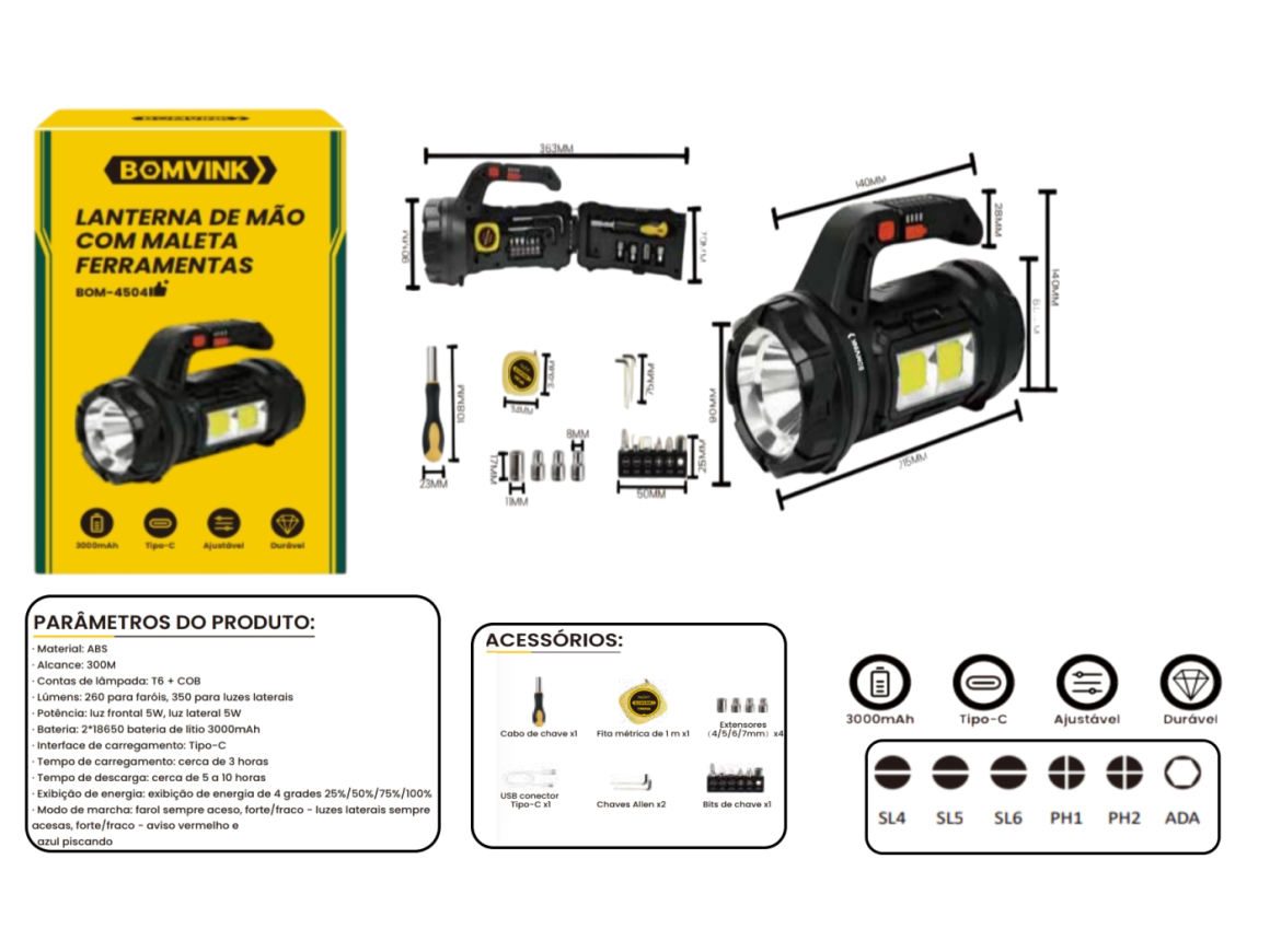 LANTERNA DE MÃO RECARREGÁVEL COM MALETA DE FERRAMENTAS BOM-4504