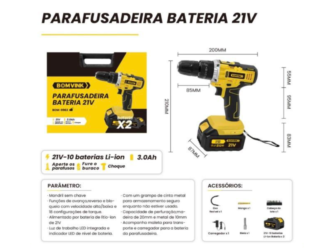 Introduzimos a Parafusadeira Furadeira Bomvink, uma ferramenta de excepcional qualidade, desenvolvida para atender às demandas mais exigentes do uso profissional. Seu design robusto e ergonômico proporciona uma experiência de trabalho eficiente e confortável.