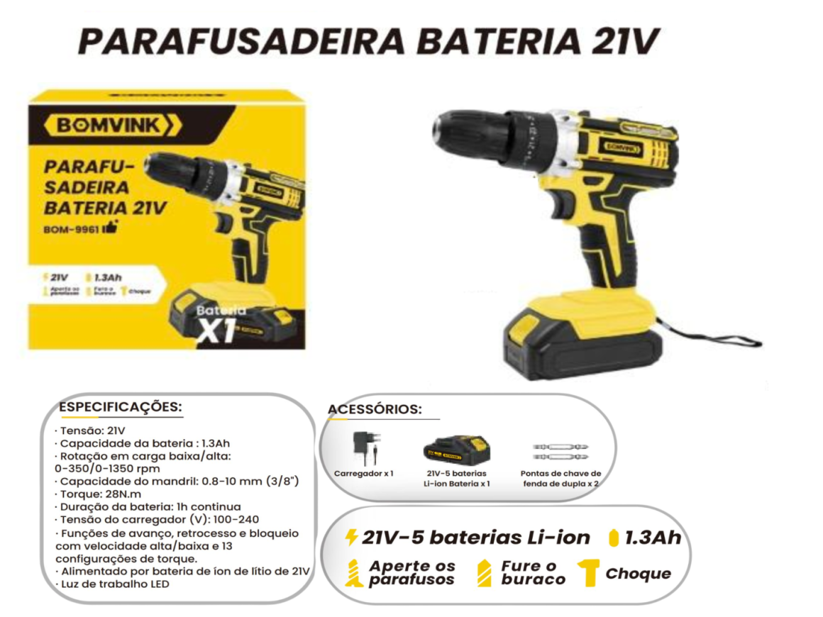 Introduzimos a Parafusadeira Furadeira Bomvink, uma ferramenta de excepcional qualidade, desenvolvida para atender às demandas mais exigentes do uso profissional. Seu design robusto e ergonômico proporciona uma experiência de trabalho eficiente e confortável.