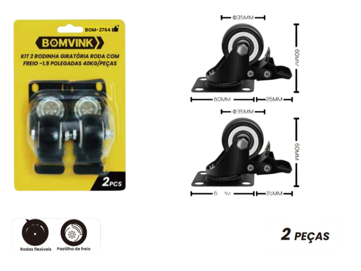 KIT RODIZIO C/ 2 PCS GIRATORIO COM FREIO 1,5" BOM-2764