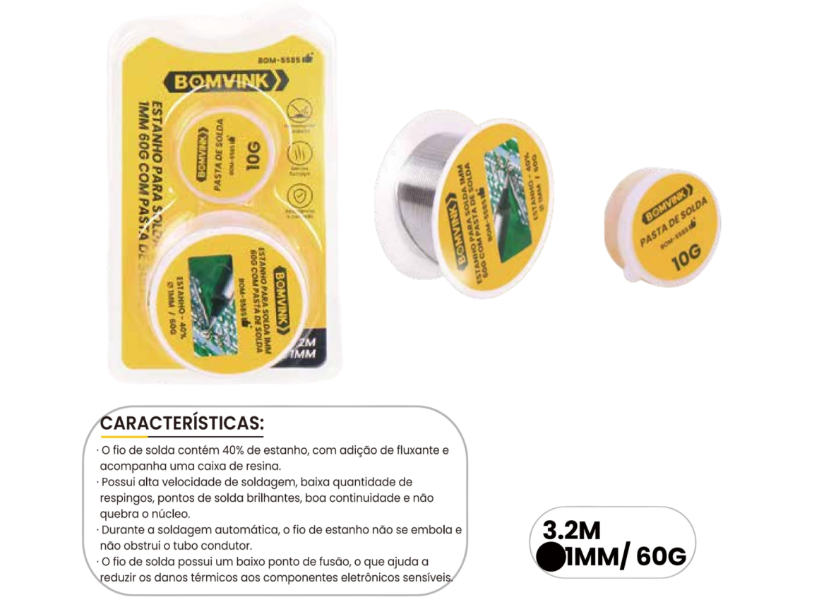 ESTANHO PARA SOLDA 1 MM 60G COM PASTA DE 10G BOM-5585