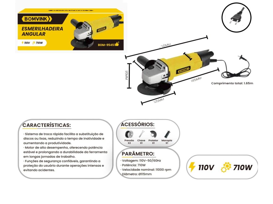 LIXADEIRA E ESMERILHADEIRA ANGULAR ELETRICA 110V 710W 115MM 4,5" BOM-9545