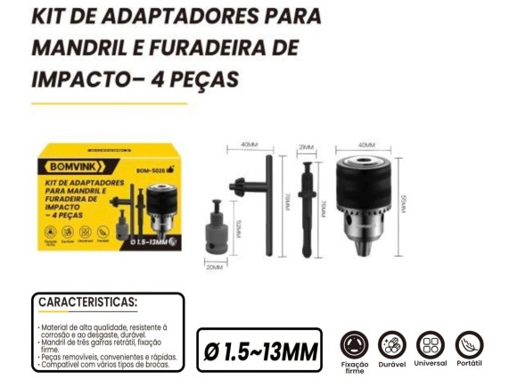 MANDRIL 13MM COM ADAPTADOR SDS PLUS 14MM E ADAPTADOR 1/2 P/ CHAVE DE IMPACTO BOM-5026