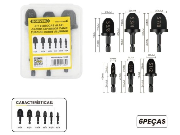 KIT DE 6 BROCAS ALARGADOR EXPANSOR DE CANO TUBO DE COBRE BOM-5588