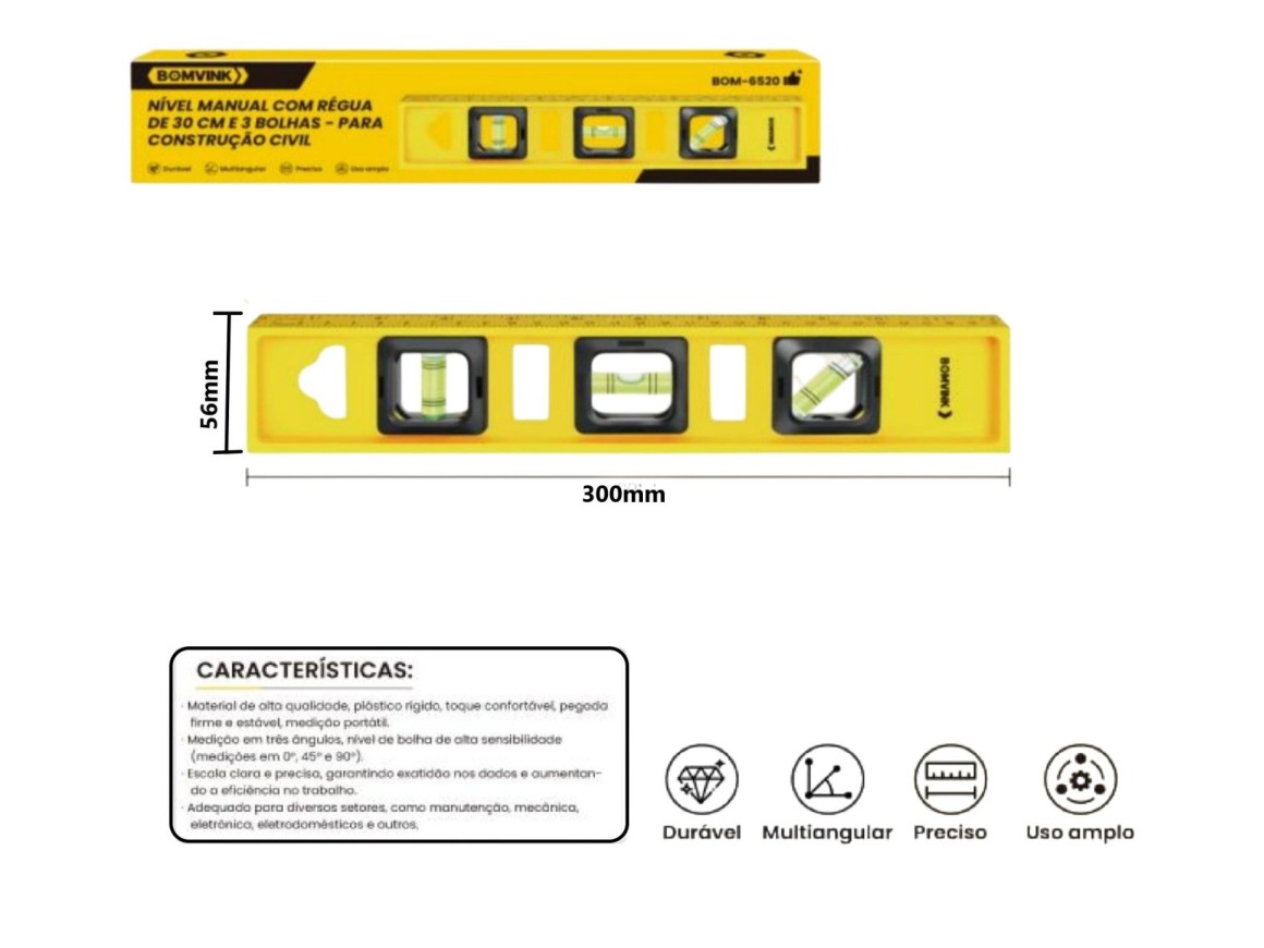 NIVEL MANUAL DE PLASTICO 3 BOLHAS 30CM BOM-6520