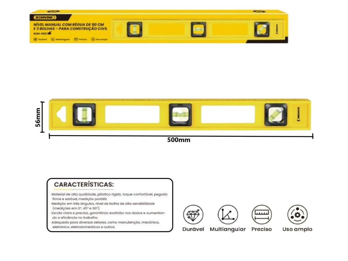 NIVEL MANUAL DE PLASTICO 3 BOLHAS 50CM BOM-6521