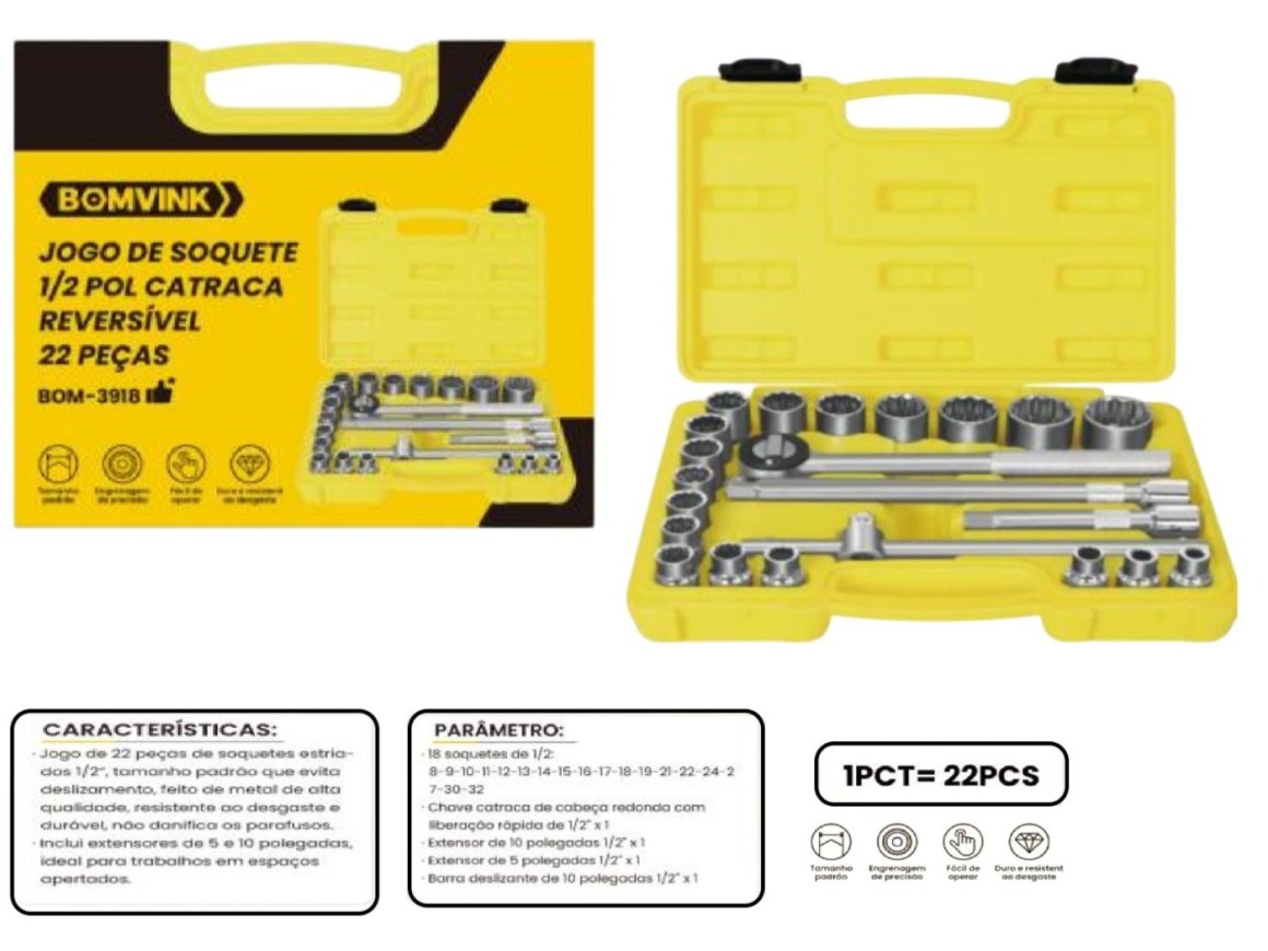 KIT FERRAMENTAS MALETA SOQUETES E CATRACA ENCAIXE DE 1/2 COM 22 PÇS BOM-3918